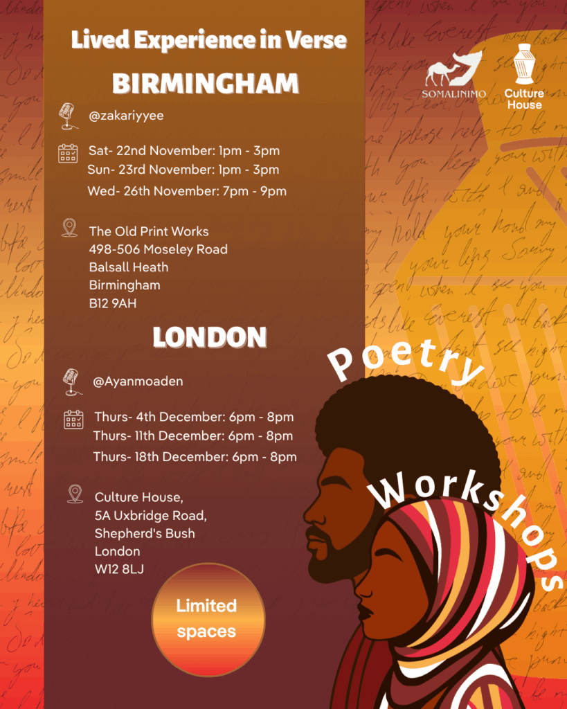 The power of Lived experience and Storytelling in verse. These sessions are in association with @somalinimouk with 3 sessions happening in Birmingham and being facilitated by @zakariyyee at The Old Print Works and 3 sessions happening in London at Culture House being facilitated by @ayanmoaden.Â